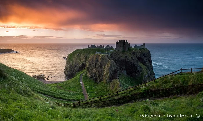 Замок Данноттар, Шотландия. Средневековая крепость, расположенная на восточном побережье Шотландии, в 3 км к югу от города Стоунхейвена и в 24 км от Абердина. Утёс, на котором стоит замок, благодаря своей неприступности стал идеальным местом для крепости. Попасть в замок можно было только двумя путями: через главный вход в расселине скалы или по узкой тропинке через пещеры к потайному входу. Название замка происходит от пиктского слова dun («форт»). Археологи обнаружили свидетельства проживания пиктов на скале Данникаер (к северу от нынешнего замка) около 5000 года до н. э. Это древнейшее пиктское укрепление, известное на сегодняшний день. В конце V века в эти земли прибыл Святой Ниниан, чтобы обратить пиктов в христианство, и основал на скале часовню. В 681 году упоминается осада крепости «Duin» — возможно, речь идёт о Данноттаре. Предположительно, в 900 году в окрестностях замка произошла битва между королём Дональдом II и викингами. Регулярные сведения о замке стали появляться после 1100 года, когда король Вильгельм I превратил крепость в административный центр государства. В 1276 году на месте часовни Святого Ниниана была построена церковь. В 1297 году её захватил Уильям Уоллес — борец за