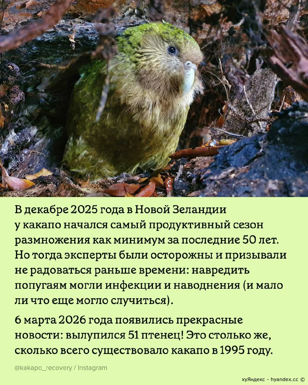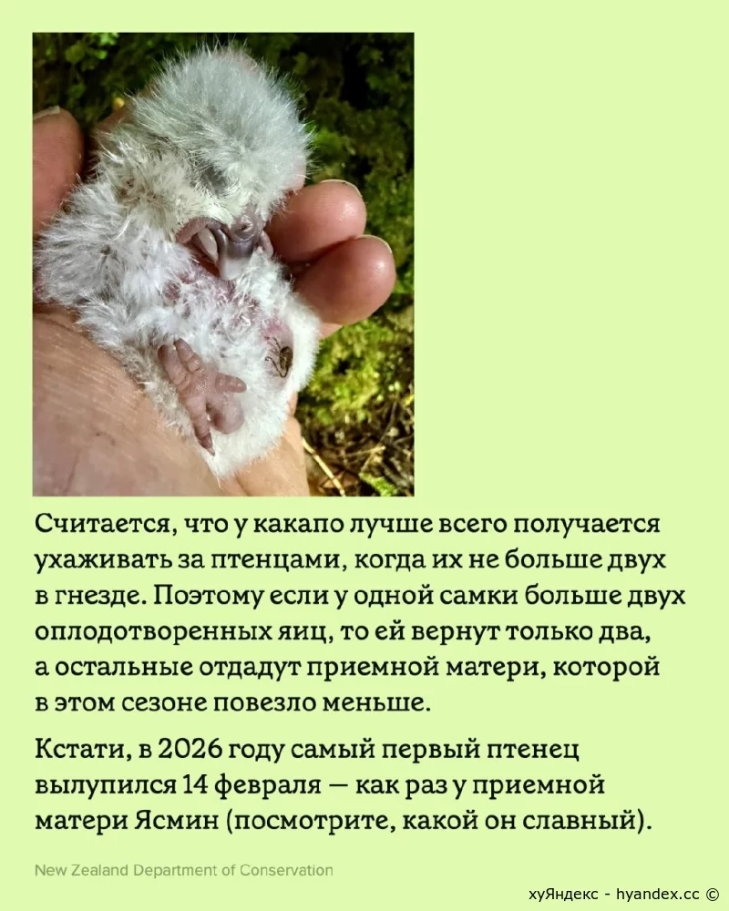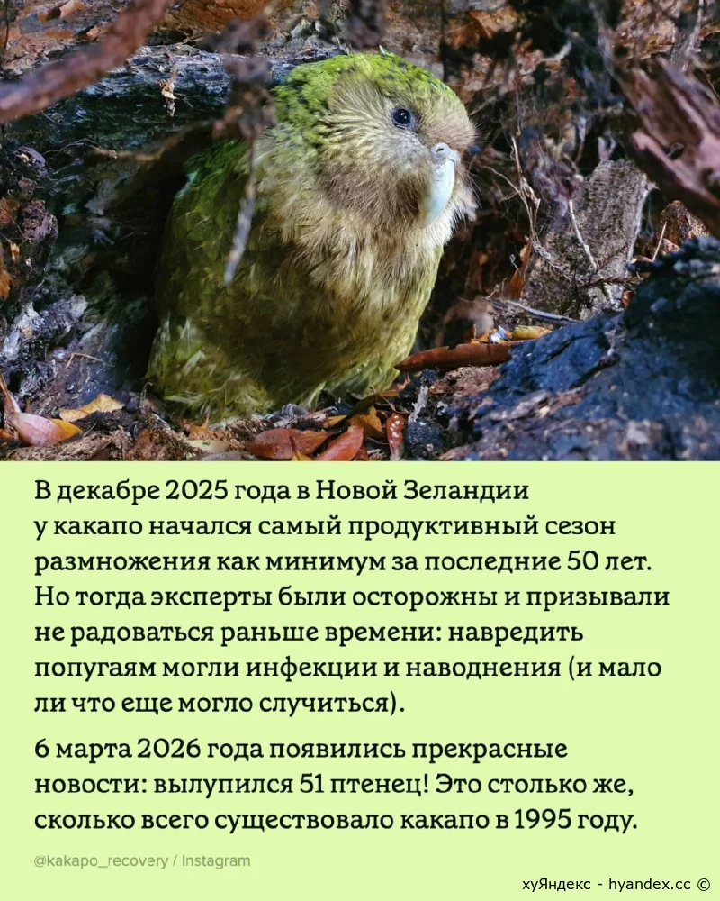 В марте 2026 года в популяции какапо крупнейшее за 50 лет пополнение. 11/03/2026 16:46 Мир природы 0 + 0 - XaOS 0 1