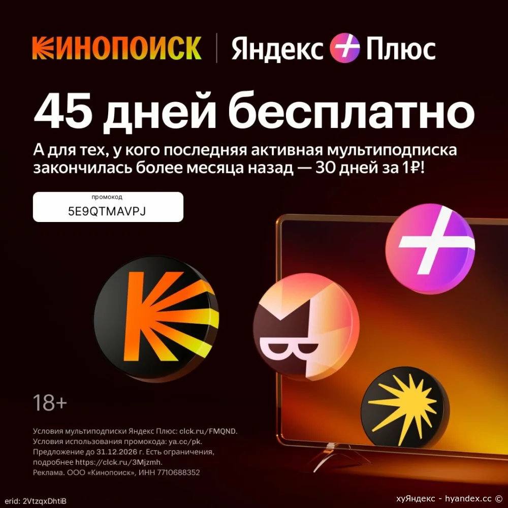 Получите доступ к миллионам фильмов и сериалов, наслаждайтесь лучшими новинками и классикой прямо у вас дома! 🍿✨ А ещё — с Яндекс Музыкой 🎶 и Яндекс Книгами 📚 вы и 3 ваши близких сможете наслаждаться любимой музыкой и книгами без ограничений! ❤️👫 🎁 Воспользуйтесь промокодом и получайте всё это бесплатно на 45 дней! 🚀 Не пропустите шанс — это выгодно и удобно! 😉 Промокод: 5E9QTMAVPJ Промокод: 5E9QTMAVPJ Реклама: ООО "ЯНДЕКС ПЛЮС" ИНН: 9705177420